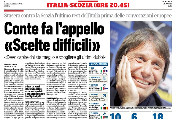 “Ci mancava il buon vecchio Gordon Strachan, di solito brillante battutista, a consigliare seccato a Conte di pensare alla sua nazionale e non alla Scozia, paragonata dal ct azzurro, nei giorni scorsi, per modello di gioco, all’Irlanda prossima avversaria europea dell’Italia. Un dato per altro oggettivo. Ma al collega scozzese, evidentemente acido per non essere arrivato a Euro 2016, non deve avere la minima idea di quanto Conte in questo momento abbia ficcato in testa un solo pensiero: scegliere alla fine i 23 giocatori giusti per andare all’assalto temerario della montagna incantata francese, a detta di tutti, sulla carta fuorimisura per la nostra piccola Nazionale. Quella di oggi, qui nello stadiolo sperduto di Ta’ Qali, in mezzo alla campagna maltese, in questo senso diventa una tappa decisiva, dopo due settimane di lavoro mirato a Coverciano, che hanno pienamente soddisfatto il ct. La Grande Verifica: si chiama ItaliaScozia. E Conte la presenta così: «Devo togliermi gli ultimi dubbi. Non chiedetemi troppe cose. Vedrete alla fine le mie scelte, saranno dolorose ma questo fa parte del mestiere di ct». TUTTI IN GRUPPO. C’è lo spazio di un mezzo sorriso, finalmente, dopo mesi di infortuni pesanti: «La buona notizia è che Thiago e Montolivo sono con noi, e hanno svolto lavori supplementari per guadagnare il terreno perduto. Non penso però di rischiarli». Resta però complicata la situazione che riguarda Daniele De Rossi, come testimonia lo stesso ct: «Daniele ha una tendinite che lo affligge; questo è un tipo di problema che  desta preoccupazione. Lui giocherà, sperando dia buone risposte». E il nodo centrale di questi giorni resta appunto l’intreccio tra le condizioni dei tre centrocampisti. Impossibile vederli tutti e tre in Francia. Conte spiega: «Non penso solo a De Rossi. Questa non è una scelta singola. E le mie considerazioni valgono anche per Monto e Thiago. Devo capire chi sta un po’ meglio, un po’ peggio, e quale sia la situazione migliore per noi». ESAMI FINALI. Se questo è il fulcro delle scelte contiane, il discorso si allarga anche ad altri reparti. In attacco per esempio, è chiaro adesso che uno degli uomini fin qui considerati tra i predestinati alla Francia sia adesso messo in discusione. Ci riferiamo a Eder: «Martin? Ha fatto tutto quello che doveva, ma sarò obiettivo nel tirare le somme: devo poter dormire sereno». QUADRO GENERALE. Insomma, molta pretattica, da parte di Conte, ma ragionamenti che danno il quadro della situazione piuttosto preciso, al di là dei dettagli. Anche perché il ct si tiene stretta la crescita complessiva della squadra: «Questa storia dei marines mi fa sorridere. Noi abbiamo lavorato normalmente, per come io intendo il lavoro. Anzi direi che più che sul piano fisico in questo momento conta più quello tattico e didattico e soprattutto mentale».   Stasera qui a Ta’ Qali, davanti a 15 mila spettatori, con grande rappresentanza scozzese, Conte ne saprà di più. Intanto ieri il Belgio ha acceso i motori contro la Svizzera: 2-1 a Ginevra grazie ai gol di Lukaku e De Bruyne, il fenomeno di Wilmots: «Sono contento per loro…» ha chiosato il nostro ct, che poi pensando alle nostre difficoltà sotto porta ha aggiunto: «Io dico che l’importante è crearle le situazioni da gol… ma è anche vero che quando sei davanti alla porta devi buttarla dentro!». Vediamo cosà gli e ci dirà la Scozia stasera”. Questo quanto si legge sull’edizione odierna de “Il Corriere dello Sport”.
