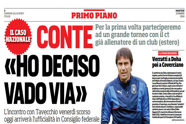 Corriere dello Sport: “Conte: «Ho deciso, vado via». L’incontro con Tavecchio venerdì scorso, oggi l’ufficialità in Consiglio federale”