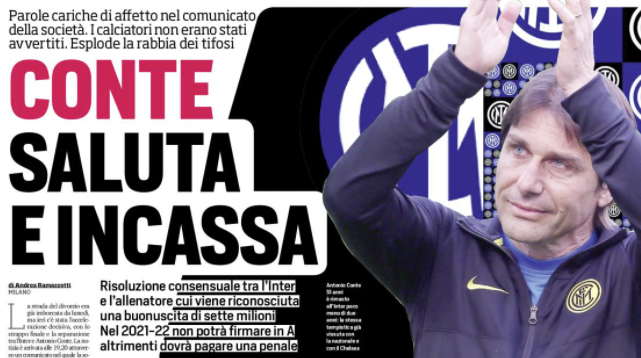 Corriere dello Sport: “Conte saluta e incassa. Risoluzione consensuale tra l’Inter e l’allenatore cui viene riconosciuta una buonuscita di sette milioni”