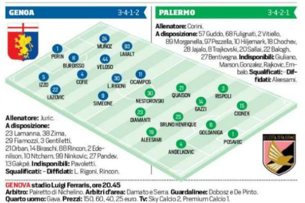 Stasera alle 20.45 il Palermo affronterà il Genoa a “Marassi”, in occasione della 17^ giornata del campionato di serie A. Il rosanero provengono da nove sconfitte consecutive, mentre i rossoblu dalla vittoria contro la Fiorentina nel recupero della terza giornata. Ecco le probabili formazioni de “Il Corriere dello Sport”: