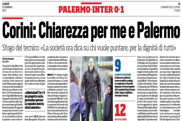 Per valutare meglio la sconfitta con l’Inter, Corini parte da lontano: «Ci vuole una visione più ampia della situazione, quando sono arrivato il Palermo veniva da 7 sconfitte consecutive, dal punto di vista psicologico i ragazzi erano in grande difficoltà. Credo che alcuni segnali si siano visti, a cominciare dai 4 punti e dai 50.000 tifosi venuti sugli spalti per due partite interne (con Chievo e Pescara, ndr). Dovevamo sfruttare allora quella situazione anche sul mercato». Invece il Palermo è rimasto lo stesso, prigioniero dei suoi limiti: «Con l’Inter abbiamo combattuto, siamo rimasti in partita, non abbiamo calciato con pericolosità in porta ma creato situazioni insidiose. Forse c’era un rigore per noi (trattenuta di Gagliardini su Goldaniga, ndr), la punizione che ha portato al gol di Quaison era regolare, la squadra ha reagito in modo positivo. Solo che il risultato dell’Empoli rende la nostra un’impresa ancora più difficile». Prova ad entrare nelle scelte tattiche: «Mettere Diamanti prima? Il Palermo ha Nestorovski che tende a venire incontro, accanto ho bisogno di qualcuno che allunghi il campo in profondità; ecco perché i due esterni e Quaison che aggredisce lo spazio. Diamanti dà il meglio utilizzato sotto la punta, non lo schiero dall’inizio perché ho anche degli equilibri difensivi da salvaguardare. Ho provato a inserirlo a partita in corso e continuo a ritenerlo un giocatore importante». Lo stadio semi vuoto lo ferisce. Corini quasi si sfoga a voce alta: «Da Palermo ho ricevuto tanto e volevo trasmettere da allenatore una spinta emotiva, innescare un percorso che tornasse a far sentire città e squadra un corpo unico. Oggi questa è la mia sconfitta più grande. Ho scelto di rimanere dopo Empoli (e le critiche del presidente, ndc.) perché la squadra ha dimostrato grande attaccamento. Adesso vedremo, è sterile continuare a dire che mi gioco la panchina nelle prossime gare, la piazza e la città meritano spirito e senso di appartenenza, la A va affrontata con determinazione se no fai brutta figura». E se Salerno lo convincesse con qualche innesto in questi giorni? Il Genio risponde così: «Chi rimane qua e chi eventualmente arriverà deve saper cosa sta affrontando. Per questo parlo di un percorso logico e di un’idea, per affrontare con dignità questa parte della stagione»”. Questo quanto si legge su “Il Corriere dello Sport”.