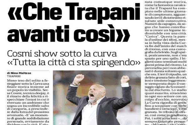 Corriere dello Sport: “Cosmi show sotto la curva: «Che Trapani, avanti così! Tutta la città ci sta spingendo»”
