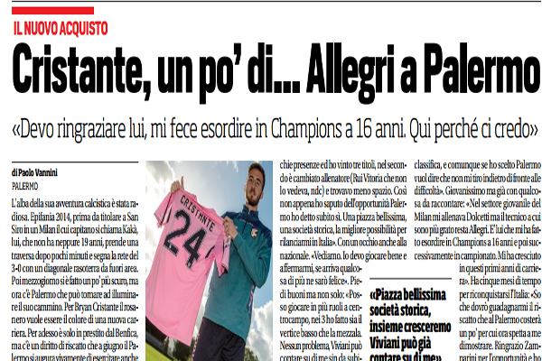 L’edizione odierna de “Il Corriere dello Sport” ha analizzato le parole di Bryan Cristante, dette ierid urante al conferenza stampa di presentazione. Ecco quanto si legge: “L’alba della sua avventura calcistica è stata radiosa. Epifania 2014, prima da titolare a San Siro in un Milan il cui capitano si chiama Kakà, lui, che non ha neppure 19 anni, prende una traversa dopo pochi minuti e segna la rete del 3-0 con un diagonale rasoterra da fuori area. Poi mezzogiorno si è fatto un po’ più scuro, ma ora c’è Palermo che può tornare ad illuminare il suo cammino. Per Bryan Cristante il rosanero vuole essere il colore di una nuova carriera. Per adesso è solo in prestito dal Benfica, ma c’è un diritto di riscatto che a giugno il Palermo si augura vivamente di esercitare anche se è piuttosto elevato (6 mln di euro, la cifra che i lusitani pagarono per prenderlo dal Milan due anni fa). «Siamo convinti che qui troverà un rilancio» ha assicurato il ds Manuel Gerolin, ricordando com’è nata la trattativa. «Sapevamo che era molto difficile, perchè Bryan giocava in uno dei club più importanti d’Europa che l’aveva pagato tanto e il cui presidente era innamorato del suo gioco. Ma col cambio di allenatore, il ragazzo ha avuto qualche problema e noi abbiamo colto l’opportunità di portarlo a Palermo. E’ uno dei prospetti migliori d’Italia». Ritorno dei piedi buoni. Anche lui era andato in “fuga” all’estero per trovare spazio. Eppure Cristante sembrava destinato a una carriera lampo. A 16 anni debutto in Champions, poi si fa strada nel Milan. Ma anche le big devono fare cassa e a volte lo fanno con i giovani. Dunque, ceduto al Benfica per una bella cifretta. «Un’esperienza che rifarei perché in un grandissimo club si cresce anche se non ho giocato tantissimo. Nel primo anno ho fatto parecchie presenze ed ho vinto tre titoli, nel secondo è cambiato allenatore (Rui Vitoria che non lo vedeva, ndc) e trovavo meno spazio. Così non appena ho saputo dell’opportunità Palermo ho detto subito sì. Una piazza bellissima, una società storica, la migliore possibilità per rilanciarmi in Italia». Con un occhio anche alla nazionale. «Vediamo. Io devo giocare bene e affermarmi, se arriva qualcosa di più ne sarò felice». Piedi buoni ma non solo: «Posso giocare in più ruoli a centrocampo, nei 3 ho fatto sia il vertice basso che la mezzala. Nessun problema, Viviani può contare su di me sin da subito. Schelotto? Non lo conosco, lo farò non appena arriverà». Inizio burrascoso. Certo che esordire in un Palermo sconvolto dalle bufere del pre-Verona… «La testa è andata subito alla partita che era importantissima – risponde Bryan – ho potuto capire però che c’è un gruppo forte e molto unito. Non mi spaventa lottare per la salvezza, in squadra ci sono ottimi elementi e spetterà a noi disputare una seconda parte di campionato migliore. Sono convinto che saliremo in classifica, e comunque se ho scelto Palermo vuol dire che non mi tiro indietro di fronte alle difficoltà». Giovanissimo ma già con qualcosa da raccontare: «Nel settore giovanile del Milan mi allenava Dolcetti ma il tecnico a cui sono più grato resta Allegri. E’ lui che mi ha fatto esordire in Champions a 16 anni e poi successivamente in campionato. Mi ha cresciuto in questi primi anni di carriera». Ha cinque mesi di tempo per riconquistarsi l’Italia: «So che dovrò guadagnarmi il riscatto che al Palermo costerà un po’ per cui ora spetta a me dimostrare. Ringrazio Zamparini per l’opportunità e ho già visto dai primi giorni che la città è molto bella da visitare». A Verona è entrato in campo solo per 1′, domenica col Genoa potrebbe partire titolare: «Il fatto di non aver giocato molto in questi mesi non è un problema – assicura Cristante – in questi mesi mi sono allenato duramente e credo di tenere il ritmo partita. A Genova un confronto diretto? Ma noi andremo per vincere, come a Verona. La mentalità deve essere sempre questa»”.