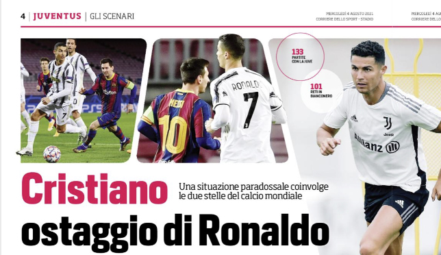 Corriere dello Sport: “Cristiano ostaggio di Ronaldo. Ha un anno di contratto (pesante) che lo blocca alla Juve. Sogna il Psg grazie al Real che punta Mbappé”