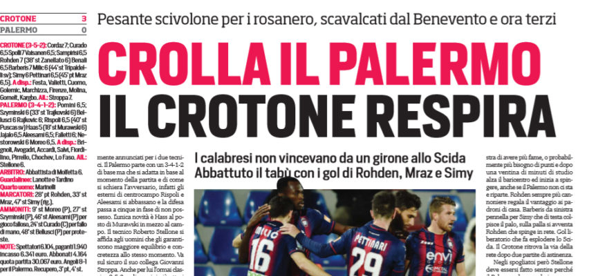 Corriere dello Sport: “Crolla il Palermo. Il Crotone respira”