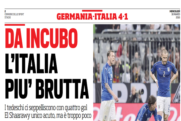Corriere dello Sport: “Da incubo, l’Italia più brutta. I tedeschi ci seppelliscono con quattro gol. El Shaarawy unico acuto, ma è troppo poco”