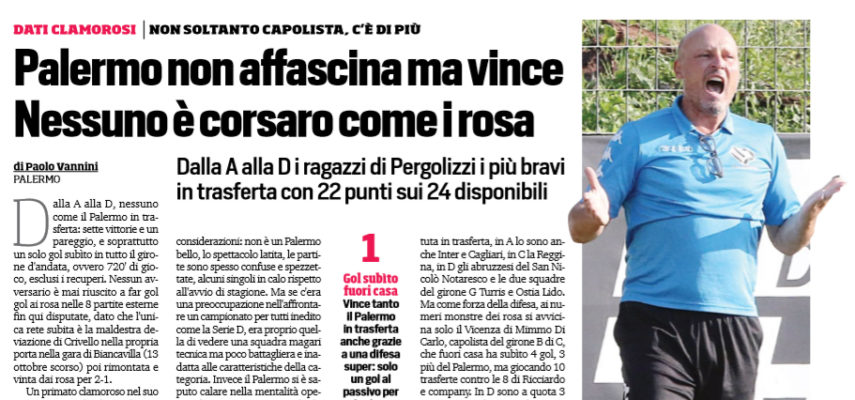 L’edizione odierna del “Corriere dello Sport” esalta le prestazioni del Palermo. Nessuno dalla A alla D come i rosanero formato trasferta: sette vittorie, un pareggio e un gol subito in tutto il girone d’andata. Un primato clamoroso nel suo genere. Il rendimento in questo momento va oltre tutte le altre considerazioni: non è un Palermo bello, lo spettacolo latita, le partite sono spesso confuse e spezzettate. Ma se c’era una preoccupazione nell’affrontare un campionato come la Serie D, era proprio quella di vedere una squadra magari tecnica ma poco battagliera e inadatta alle caratteristiche della categoria. Invece il Palermo si è saputo calare nella mentalità operaia che era necessaria, non bada al sottile ma al concreto, sfrutta gli episodi, ultimo il rigore che in Calabria ha sbloccato il risultato, per poi far valere le migliori individualità e soprattutto fidare su una difesa che in trasferta è realmente impenetrabile. Da capire i motivi delle prestazioni difensive alterne tra le mura amiche.