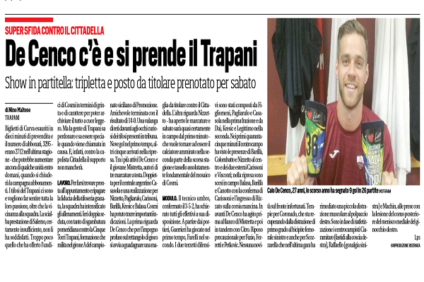 Corriere dello Sport: “De Cenco c’è e si prende il Trapani. Show in partitella: tripletta e posto da titolare prenotato per sabato”