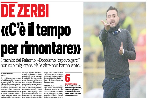 Corriere dello Sport: “De Zerbi: «C’è il tempo per rimontare». Il tecnico del Palermo: «Dobbiamo “capovolgerci” non solo migliorare. Ma le altre non hanno vinto»”