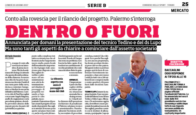 Corriere dello Sport: “Dentro o fuori. Annunciata per domani la presentazione del tecnico Tedino e del ds Lupo. Ma sono tanti gli aspetti da chiarire a cominciare dall’assetto societario”