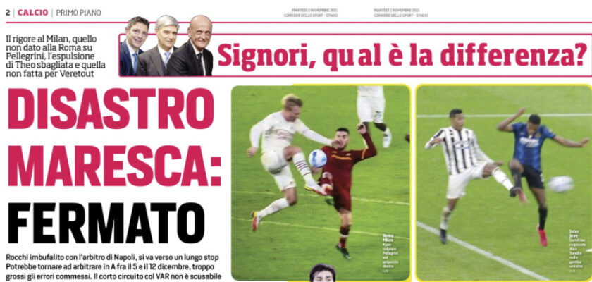 Gestione schizofrenica delle vicende disciplinari, cattiva lettura degli episodi cruciali, nessuna sollecitazione una volta riviste al video le immagini del rigore sul quale non ha voluto cedere di un millimetro: Fabio Maresca sarà fermato, lo stop si prevede lungo, mentre Mazzoleni non ha grosse responsabilità, tutt’altro. Ok, forse la ferita è ancora fresca, magari col passare del tempo certi giudizi saranno riveduti, corretti, limati. Fra l’altro, Maresca dovrebbe andare all’estero con l’Uefa, quindi non sarà disponibile per un po’ in Italia. Però sicuramente domenica prossima resterà fermo (sarebbe un azzardo), poi ci sarà la sosta delle Nazionali, possibile faccia uno o due turni di VAr in B, una partita in B e siamo ai primi di dicembre. Lì dipenderà da lui e dal designatore: potrebbe raddoppiare (e allora il 5 dicembre potrebbe tornare in A) oppure restare fermo di turno (quindi fare un IV uomo o un VAR in A) e poi rientrare il 12 dicembre. Quando in giro c’è già l’idea del Natale che s’avvicina…