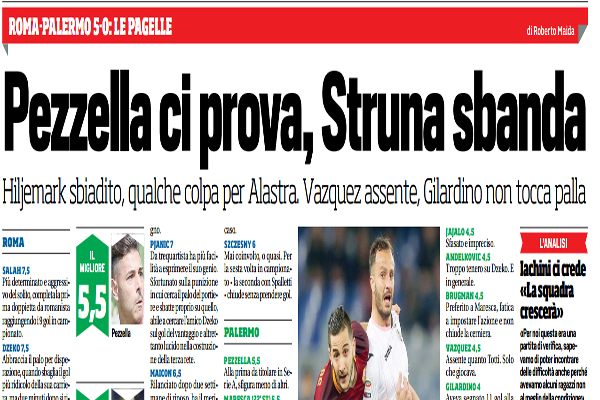 L’edizione odierna de “Il Corriere dello Sport” ha stilato le pagelle dei rosanero dopo la batosta contro la Roma all’Olimpico. Di seguito le valutazione dei rosanero: