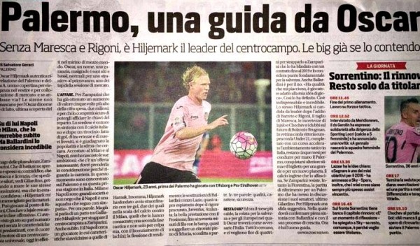 Secondo quanto riporta l’edizione odierna de “Il Corriere dello Sport” Oscar Hilejamrk avrebbe attirato l’interesse di tanti club di serie A, ultima per ordine di tempo dopo il Milan, è stato il Napoli, il quale avrebbe già aperto un discorso con i rosa per portarlo in Campania già a gennaio. Ma sempre quanto si legge sul qutodiaino, Ballardini avrebbe dichiarato incedibile il centrocampista svedese. Di seguito ecco quanto scrive su di lui il Corriere: “Oscar Hiljemark, autentica rivelazione del Palermo e della A, uomo copertina per eleganza nel vestire e per collocazione di mercato e se andasse via? Le sirene non mancano per l’Oscar di nome e di fatto, l’ultima scoperta del mago delle plusvalenze, Zamparini. Che di battute ne spreca e spesso si contraddice, che attacca e licenzia, che spedisce siluri, vedi Gilardino gettando a mare le sue stesse convinzioni. Per il patron che ha già ottenuto un aumento di valore cinque volte più alto della cifra spesa, sarà un affare. Lo svedese è entrato in sintonia con il calcio italiano e dopo un tirocinio fatto di gol si è guadagnato la popolarità e la stima che cercava. Accostato al Milan e al Napoli non ha nascosto le sue ambizioni di giocare in grandi palcoscenici. Insomma, Hiljemark ha sfondato: avvio straordinario con tre gol, due dei quali a San Siro, quelli che lo hanno consacrato. Ora tutti lo cercano e ci vogliono fior di quattrini per strapparlo a Zamparini che lo ha blindato fino al 2019 e lo considera punto fondamentale per la salvezza, anche Ballardini è per il no alla cessione: «Ha qualità che mi piacciono, è giocatore adatto alla mia idea di gioco». Così lo ha definito il tecnico ravennate. Ora il centrocampista dovrà confermare piena sintonia con lo stesso tecnico e con il suo processo di crescite. E’ lui l’uomo guida”