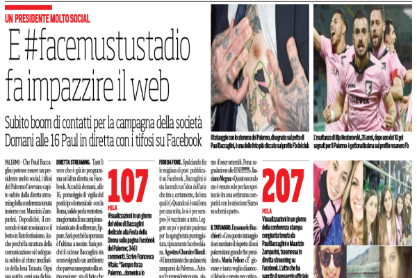“Che Paul Baccaglini potesse essere un presidente molto social, i tifosi del Palermo l‘avevano capito subito dalla diretta streaming della conferenza tenuta insieme con Maurizio Zamparini. Dopodiché, il crescendo è stato rossiniano e il botto in Rete fortissismo. Anche perché la struttura della comunicazione si è adeguata subito al ritmo mediatico della Iena Tatuata. Ogni sua sortita, ogni sua dichiarazione, ogni sua azione viene seguita in Rete momento per momento e riscuote l’immediato seguito popolare. Come l’hashtag #facemustustadio. Un trionfo. DIRETTA STREAMING. Tant’è vero che è già in programma un’altra diretta su Facebook. Accadrà domani, alle 16, pomeriggio di vigilia del posticipo domenicale con la Roma, valido per la ventottesima giornata di un campionato lastricato di sofferenze, Eppure. Sarà perché la speranza è l‘ultima a morire. Sarà perché il ciclone Baccaglini sta sconvolgendo un ambiente che pareva rassegnato alla retrocessione: sta di fatto che oggi non sembrano più incolmabili quei 7 punti di svantaggio sull’Empoli quart’ultimo, pensando anche allo scontro diretto in programma all’ultimo giro. FIOR DA FIORE . Spulciando fra le migliaia di post pubblicati su Facebook , Baccaglini si sta facendo un’idea dell’aria che tira e, certamente, da Iena qual è («Quando si è stati Iena per una volta, lo si è per sempre») è vaccinato a tutto. Leggete un po’ e portate pazienza per la sgangherata punteggiatura, tipicamente facebookiana. Agostino Chumlee Blandi : «Vi lamentavate che andasse via zamparini da Palermo…. Adesso c’è un presidente nuovo… giovane e con tanta grinta…. E vi lamintati u stesso». Carletto Antonini : «Paul, al di là della Tua innegabile simpatia, riteniamo la Tua nomina un’altra delle solite zampariniate……….. Speriamo d’esser smentiti. Pena: segnalazione alle IENE!!!!!!!!!!». Luciano Megna: «Questo secondo me è venuto solo per fare spettacolo fra una settimana comparirà con lo striscione Siamo su scherzi a parte». IL TATUAGGIO.Emanuele Bucchieri: «Con questo tatuaggio ti sei meritato il rispetto di noi palermitani grande the president». Maria Felice: «E’ giovane e tanta voglia diamocci fiducia e presto per criticare». Comu Finìu??? A Schifìu Finìu… «Prima lo stadio… non si può competere ad alti livelli senza stadio… meglio farsi trovare pronti… Grande Presidente!»”. Questo quanto riportato da “Il Corriere dello Sport”.