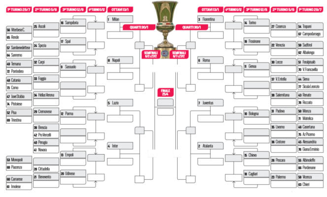 “Con qualche ora di ritardo, necessaria per aspettare le ultime decisioni sugli organici dei campionati, la Lega di Milano ha approntato il tabellone della Coppa Italia, che il prossimo 29 luglio darà il via alla nuova stagione (giovedì prossimo invece, negli studi Sky di Milano, sarà sorteggiato il calendario di serie A). Si comincia quindi tra due domeniche con 36 squadre di serie C e D in campo. Il 5 agosto toccherà alle formazioni di serie B, il 12 ai primi club di A, mentre le 8 teste di serie entreranno in gara solo a gennaio, negli ottavi di finale. Da una parte del tabellone Milan-Napoli e Lazio-Inter sono i possibili quarti di finale, dall’altra parte Fiorentina-Roma e Juventus-Atalanta. Come tradizione, si giocherà in gara unica (con tempi supplementari ed eventualmente calci di rigore) fino ai quarti di finale compresi, in casa della squadra che si trova in tabellone con il punteggio più basso. C’è però una novità, il sorteggio del campo nel caso di incroci tra due squadre di serie A. Da ricordare anche la quarta sostituzione nei tempi supplementari e l’ingresso del Var a partire dagli ottavi”. Questo quanto riportato dall’edizione odierna de “Il Corriere dello Sport”.