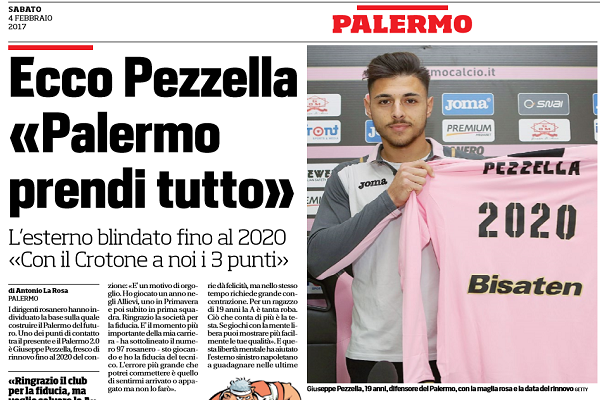 Corriere dello Sport: “Ecco Pezzella: «Palermo prendi tutto». L’esterno blindato fino al 2020: «Con il Crotone a noi i 3 punti»”