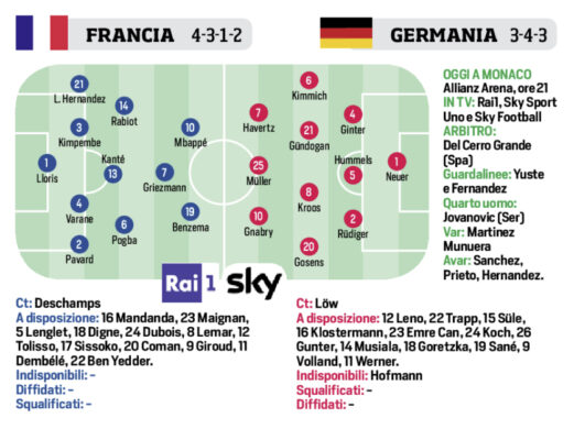 Deschamps avrà a disposizione tutti i suoi 26 giocatori a disposizione. Löw ha annunciato il recupero di Goretzka.