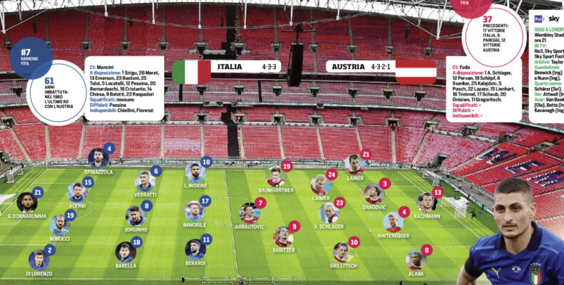 Stamattina, nell’allenamento rimediato in extremis, Mancini farà le ultime valutazioni, che dovrebbero premiare Acerbi accanto a Bonucci e Verratti in mezzo al campo.