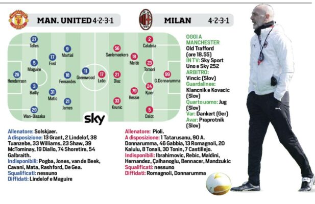 Corriere dello Sport: “Europa League, ottavi di finale. Oggi Manchester United-Milan, le probabili formazioni”