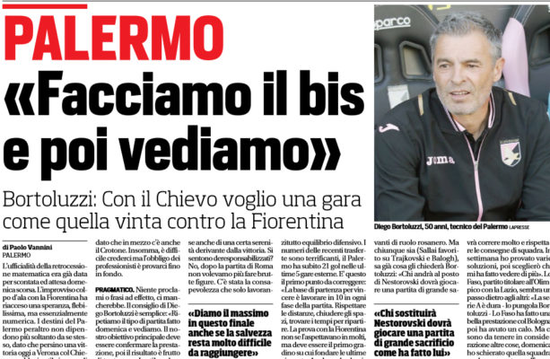 “L’ufficialità della retrocessione matematica era già data per scontata ed attesa domenica scorsa. L’improvviso colpo d’ala con la Fiorentina ha riacceso una speranza, flebilissima, ma essenzialmente numerica. I destini del Palermo peraltro non dipendono più soltanto da se stesso, dato che persino una vittoria oggi a Verona col Chievo sarebbe inutile in caso di identico risultato di Empoli e Genoa. I punti di distacco sono 10 con soli 360′ da giocare, ci sono i confronti diretti al Barbera proprio con le due potenziali rivali, ma va ricordato che in mezzo c’è anche il Crotone. Insomma, è difficile crederci ma l’obbligo dei professionisti è provarci fino in fondo. Pragmatico. Niente proclami o frasi ad effetto, ci mancherebbe. Il consiglio di Diego Bortoluzzi è semplice: «Ripetiamo il tipo di partita fatto domenica e vediamo. Il nostro obiettivo principale deve essere confermare la prestazione, poi il risultato è frutto di tante cose. Inutile volare con la fantasia o pensare a quanto fanno gli altri». Eppure a sentire il suo tecnico il Palermo è in salute. «In settimana la squadra si è allenata benissimo, merito forse anche di una certa serenità derivante dalla vittoria. Si sentono deresponsabilizzati? No, dopo la partita di Roma non volevamo più fare brutte figure. C’è stata la consapevolezza che solo lavorando in allenamento, mettendo la giusta attenzione e cura dei particolari, si poteva ottenere qualcosa». Bortoluzzi (4 punti in 3 gare) chiede innanzitutto equilibrio difensivo. I numeri delle recenti trasferte sono terrificanti, il Palermo ha subito 21 gol nelle ultime 5 gare esterne. E’ questo il primo punto da correggere: «La base di partenza per vincere è lavorare in 10 in ogni fase della partita. Rispettare le distanze, chiudere gli spazi, trovare i tempi per ripartire. La prova con la Fiorentina non se l’aspettavano in molti, ma deve essere il primo gradino su cui fondare le ultime giornate. Anche se la classifica sembra obiettivamente compromessa». Nessuna anticipazione su come verrà sostituito l’unico centravanti di ruolo rosanero. Ma chiunque sia (Sallai favorito su Trajkovski e Balogh), sa già cosa gli chiederà Bortoluzzi: «Chi andrà al posto di Nestorovski dovrà giocare una partita di grande sacrificio come ha fatto lui domenica: ha dato tutto, è stato pronto a rientrare sui mediani. Non sarà una prima punta tradizionale ma dovrà correre molto e rispettare le consegne di squadra. In settimana ho provato varie soluzioni, poi sceglierò chi mi ha fatto vedere di più». Lo Faso, partito titolare all’Olimpico con la Lazio, sembra un passo dietro agli altri: «La serie A è dura – lo pungola Bortoluzzi – Lo Faso ha fatto una bella prestazione col Bologna poi ha avuto un calo. Ma ci sono da tenere in considerazione altre cose, domenica ho schierato quella squadra anche per puntare sull’esperienza. Avrà modo di mettersi in mostra. Deve andar dentro e dare tutto quello che ha, lavorare con pazienza e imparare guardando gli altri».”. Questo quanto si legge sull’edizione odierna de “Il Corriere dello Sport”.