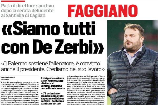 “È una difesa complicata, per certi versi anche coraggiosa, perché Daniele Faggiano sa che il calcio ragiona in base a punti e risultati e il Palermo oggi non può che essere sul banco degli imputati con tutti i suoi responsabili. Ma è la logica del suo ruolo. Il direttore sportivo ci mette la faccia e chiede la cosa più difficile in questo momento e in questa città da tempo disillusa: positività, ottimismo, convinzione che le cose possano cambiare. Si riparte da De Zerbi e la vera novità sembrerebbe (con Zamparini il condizionale è più di un obbligo) la fiducia non diciamo in un progetto, ma almeno in una scelta in fondo compiuta appena due mesi fa. «Sono qui in un momento difficile a dirvi che non siamo abbattuti, ma positivi – è il primo messaggio che vuole mandare all’esterno Faggiano – qualcuno potrebbe pensare che dire così dopo quattro sconfitte sia da pazzi, invece no. Sapevamo di dover soffrire, speravamo di non farlo così tanto e il dispiacere maggiore è che con noi soffre chi ci sta vicino a cominciare dai tifosi. Ma il nostro obiettivo è quello di cambiare rotta velocemente ed al contempo di non fare passi sbagliati». Faggiano assicura che la conferma di De Zerbi non è di facciata: «Zamparini ha visto una squadra che ha reagito, da uomo che capisce di calcio studia le partite più di noi, sta attento ai particolari. L’esonero era la cosa più facile, magari per poi addossare la colpa al presidente o all’ambiente che a Palermo è sempre così. Invece io ritengo che l’ambiente si crea, bisogna credere nel lavoro. Non ho mai pensato al cambio e non chiamato nessun altro allenatore, semmai c’è qualcuno che cerca di avvicinarci e poi dice di essere stato contattato». «È ovvio che dobbiamo fare meglio, mi sono stufato di perdere, dobbiamo fare punti subito. Ma la scelta della società è quella di continuare a seguire tutti il mister, convinti che solo col lavoro potremmo ottenere i risultati che ci servono. Siamo uniti non come prima ma più di prima, avreste dovuto vedere l’atteggiamento di coloro che non hanno giocato a Cagliari. Adesso però ci devono aiutare i risultati, ci serve una iniezione di fiducia. Io credo che il Palermo visto lunedì se la possa giocare con tutti». Ma non si può sorvolare in continuazione sui limiti emersi: «Ci vuole più attenzione – concorda Faggiano – anche io sono arrabbiato ma positivo. Squadra fragile mentalmente? A Cagliari la reazione si è vista. Quanto ai leader, in un gruppo ce ne devono essere diversi, dentro e fuori dal campo. Ce la giocheremo solo con altre tre contendenti la salvezza? Non faccio calcoli, pensiamo solo a noi stessi e a vincere». Il tema delicato è quello dei rinforzi. Faggiano non può dirlo, il suo compito è tutelare il gruppo con cui bisogna andare avanti per altri due mesi. Ma non riconoscere le mancanze dell’organico sarebbe rifiutare la realtà: «Non cerchiamo alibi, potremmo parlare anche della mancanza di elementi importanti nello stesso reparto (Gonzalez e Rajkovic, ndc) ma in fondo gli infortuni ce li hanno anche le altre squadre. Siamo questi, non mi sentirete parlare di mercato fino al 31 dicembre. Andremo avanti così, ho un gruppo da difendere e non voglio scuse per nessuno, neppure per me che sono arrivato dopo ma ho scelto di dire sì, sapendo delle difficoltà. E dunque non mi tiro indietro». Le ammissioni sono minime ma già significative: «Certo non posso dire che a gennaio non arriverà nessuno, ma qualunque operazione la devo fare in silenzio. Per ora stringiamo i denti e guardiamo anche alle note positive: come il rendimento di Nestorovski che nel suo primo anno in A fa la guerra contro tutti, è un esempio perché non sapendo la lingua sta imparando l’italiano, ed è un motivo di vanto per il Palermo e il presidente»”. Questo quanto si legge su “Il Corriere dello Sport”.