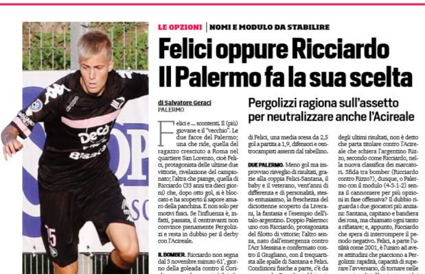 Corriere dello Sport: “Felici oppure Ricciardo. Il Palermo fa la sua scelta. Il centravanti non convince Pergolizzi…”
