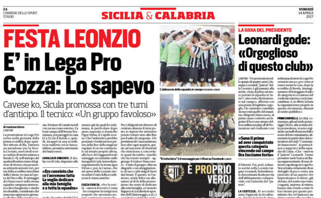 “La promozione in Lega Pro arriva nella giornata della prima sconfitta dopo quindici vittorie di fila. Davvero un paradosso per la Sicula Leonzio, mercoledì scorso caduta di stretta misura a Rende (1-0), nell’anticipo del quattordicesimo turno del girone di ritorno, ma promossa aritmeticamente ieri, per via della sconfitta rimediata dalla Cavese, in casa ad opera del Roccella. Il vantaggio dei bianconeri sulla stessa squadra campana ammonta a dieci lunghezze e risulta incolmabile, considerato che mancano appena tre giornate alla fine della stagione regolare. Un cammino trionfale quello della squadra allenata da Ciccio Cozza, tecnico ingaggiato all’indomani della pesante sconfitta rimediata dai lentinesi nel confronto casalingo con l’Igea Virtus, quello 0 a 4 che costò la panchina a Seby Catania. Il trainer di Cariati esordì con un successo esterno, 3 a 0 sul campo dell’Aversa Normanna, poi pareggiò in casa (2 a 2) con il Rende e, quindi, incappò in una sconfitta in trasferta con la Sancataldese, prossimo avversario dei bianconeri. cavalcata vincente. Il derby con il Gela, disputato allo stadio “Angelino Nobile” l’11 dicembre scorso, diede il via all’appassionante cavalcata: 2 a 1 il punteggio della prima di quindici vittorie consecutive, la più recente centrata il 9 aprile scorso, a spese dell’Aversa Normanna. Il “profumo” della Lega Pro, in effetti, i bianconeri lo annusavano già da qualche settimana, in particolare dopo avere superato a domicilio l’Igea Virtus, il 2 aprile scorso. Che l’aritmetica avrebbe premiato i lentinesi ben prima della fine della stagione regolare lo si era cominciato ad intuire proprio allora, alla luce del ragguardevole vantaggio accumulato sulle inseguitrici più immediate, segnatamente la stessa Igea Virtus e, poi, la Cavese, che ad opera della Leonzio aveva subito l’onta della sconfitta tra le mura amiche. «Per la verità – osserva il tecnico Cozza – ho compreso in tempi non sospetti che avremmo potuto centrare la promozione, anche se non immaginavo con tre turni di anticipo. Prima di assumere la guida della squadra, i dirigenti mi avevano sottoposto la visione di alcune partite in dvd e mi ero reso conto che, attraverso 3 o 4 innesti, si poteva puntare davvero alla Lega Pro; i dirigenti mi chiesero di centrare almeno il terzo posto, io risposi che avremmo potuto lottare sino alla fine per il salto di categoria». E le previsioni di Cozza andarono ben oltre ogni auspicio, grazie ad una serie di elementi che riuscirono a concordare quasi da subito. «Quello che ha tenuto sempre – aggiunge il trainer bianconero – è stato il gruppo. Mai un disguido o un atteggiamento di uno o più singoli fuori dai binari. E questo, ve l’assicuro, rende felice un allenatore al di là della promozione che sento di dedicare alla mia famiglia, a Carmelo Rappoccio (ex direttore sportivo dell’Hinterreggio, n.d.c.) e a tutta la società che, assieme alla squadra, ho sentito sempre vicina». Dopo la pausa pasquale, negli ultimi tre turni la Leonzio affronterà in casa la Sancataldese e la Turris (23/4 e 7/5); nel mezzo (30/4) il derby in trasferta con il Gela”. Questo quanto si legge su “Il Corriere dello Sport”.