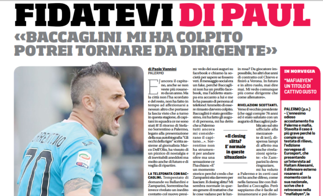 LA TELEFONATA CON BACCAGLINI. Tempestato di domande su Ballardini e Zamparini, Sorrentino ha invece rivelato un inedito contatto col nuovo presidente (ma non ancora proprietario) del Palermo: «E’ successo il giorno del mio compleanno a fine marzo: vedo dei suoi auguri su facebook e chiamo la società per sapere se fossero veri. Il messaggio social era un fake, perché Baccaglini non ha un profilo facebook, ma l’addetto stampa era accanto a lui e me lo ha passato di persona al telefono! Ammetto di essere rimasto davvero colpito. Baccaglini è stato gentilissimo, mi ha fatto gli auguri di persona, mi ha detto che a Palermo tutti ancora mi considerano il capitano…». Sorrentino non ha strumenti per andare oltre ma una sensazione ce l’ha chiara: «E’ un momento storico perché credo che Zamparini stia davvero per lasciare. Il closing slitta? Mi sembra normale in questo genere di trattative che le cose vadano per le lunghe. Non conosco abbastanza Baccaglini, ma ho visto che fuori dal calcio ha fatto tanto. Io di nuovo in rosa? Da giocatore impossibile, ho altri due anni di contratto col Chievo e finirò a Verona. In futuro e in altro ruolo, mai dire mai. Mi vedo comunque più come dirigente che come allenatore».