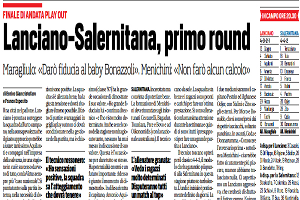 Corriere dello Sport: “Finale di andata playout. Lanciano-Salernitana, primo round”