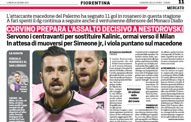 “Intanto Nestorovski, aspettando che dal fronte Genoa si muovano le tessere del puzzle per portare Giovanni Simeone, il Cholito, a Firenze. Corvino si prepara a sferrare gli assalti decisivi, a cominciare da quello per il macedone di proprietà del Palermo. Servono i gol per sostituire Nikola Kalinic, sempre più corteggiato dal Milan che punta ad averlo subito anche in vista del terzo turno di qualificazione alla prossima Europa League, e non si può aspettare, perché tra meno di due settimane la squadra raggiungerà Moena per la prima parte del ritiro. In Val di Fassa ci saranno Babacar, le pianticelle della Primavera, con in testa l’altro figlio d’arte, Sottil, ma serve di più.