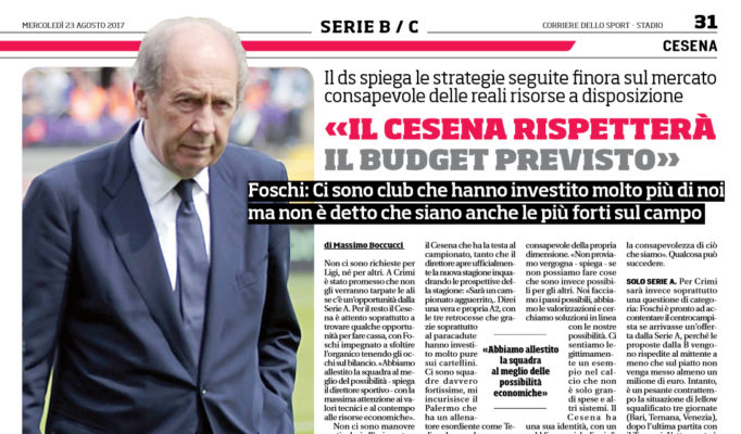 Corriere dello Sport: “Foschi: «In serie B ci sono squadre davvero fortissime, mi incuriosisce il Palermo…»”