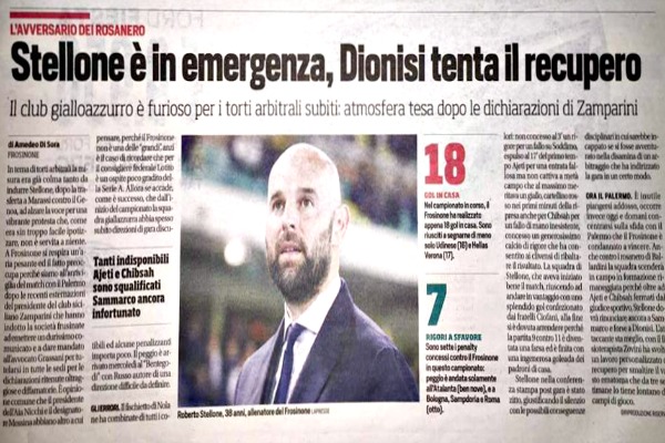 “In tema di torti arbitrali la misura era già colma tanto da indurre Stellone, dopo la trasferta a Marassi contro il Genoa ad alzare la voce per una vibrante protesta che, come era sin troppo facile ipotizzare, non è servita a niente. A Frosinone si respira un aria pesante ed il fatto preoccupa perché siamo all’antivigilia del match contro il Palermo dopo le recenti esternazioni del presidente del club siciliano Zamparini che hanno indotto la società frusinate ad emettere un comunicato e a dare mandato all’avvocato Grassani per tutelarsi in tutte le sedi per le dichiarazioni ritenute oltraggiose e diffamatoria. Inoltre mercoledì al Bentegodi l’arbitro Russo è stato autore di una direzione difficile da definire; il fischietto di Nola ne ha combinate di tutti i colori a cui la squadra di Stellone dopo esser passata in vantaggio all’inizio del match, si è dovuta arrendere perché la partita in 9 contro 11 è diventata una farsa. […] Ora è inutile piangersi addosso, occorre invece oggi e domani concentrarsi sulla sfida con il Palermo che il Frosinone è condannato a vincere. Anche contro i rosanero di Ballardini. La squadra di Stellone scenderà in campo con una formazione rimaneggiata, perché oltre ad Ajeti e Chibsah, il tecnico gialloblù dovrà fare a meno di Sammarco e forse Dionisi […]”. Questo quanto si legge sull’edizione odierna de “Il Corriere dello Sport”.