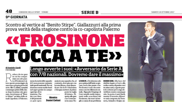 Corriere dello Sport: “«Frosinone tocca a te». Longo avverte i suoi: «Avversario da Serie A con 7/8 nazionali. Dovremo dare il massimo»”