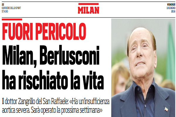 Corriere dello Sport: “Fuori pericolo: Milan, Berlusconi ha rischiato la vita. Il dottor Zangrillo del San Raffaele: «Ha un’insufficienza aortica severa. Sarà operato la prossima settimana»”