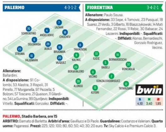 Corriere dello Sport: “Gilardino e Djurdjevic verso la panchina – le probabili formazioni di Palermo-Fiorentina”