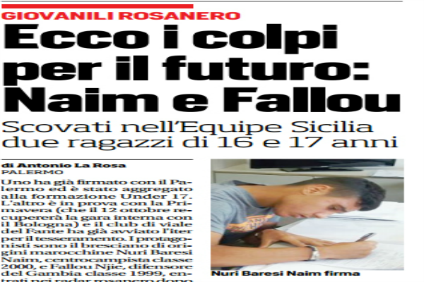 Corriere dello Sport: “Giovanili rosa, ecco i colpi per il futuro: Naim e Fallou. Scovati nell’Equipe Sicilia, due ragazzi di 16 e 17 anni”