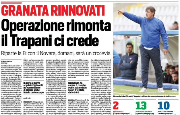 “La sfida di domani, contro il Novara dell’ex tecnico granata Roberto Boscaglia, tra i protagonisti della scalata del Trapani nel calcio che conta, sarà un crocevia importante per la stagione degli uomini di Alessandro Calori. I siciliani intendono dare un taglio netto al passato, anche a quello recente. Vogliono mettere da parte le gioie vissute nella seconda parte della precedente stagione e i malumori che si sono creati, successivamente, in estate e nella prima parte dell’attuale, dalla quale il Trapani è uscito con le ossa rotte. I tredici punti in classifica sono il risultato di un girone di andata insoddisfacente, deludente, a tratti anche sconfortante. La fotografia è l’ultimo posto in classifica, a una distanza considerevole, addirittura sette punti dalla penultima, la Ternana. Servirà un’impresa o, come ha detto il tecnico Calori, «un’impresona». Occorreranno 35 punti – punto più, punto meno – per poter realizzare un piccolo miracolo. Nei fatti, sono nove in meno rispetto a quelli fatti registrare nella seconda parte della precedente stagione. Quella in cui fu sfiorato un altro miracolo, certamente più gradevole. Il Trapani, dunque, riceve il Novara, che al «Provinciale» non ha mai vinto. Il bilancio è di una vittoria dei granata e un pareggio. La gara di andata, giocata al «Piola», terminò 2-2. Per il Trapani segnarono De Cenco e Ferretti, che non sono più calciatori granata. E già