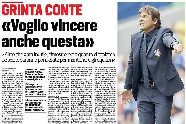 Corriere dello Sport: “Grinta Conte: «Voglio vincere anche questa». Il ct azzurro pondera le sue scelte per mantenere gli equilibri”