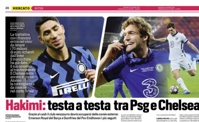 Corriere dello Sport: “Hakimi: testa a testa tra Psg e Chelsea”