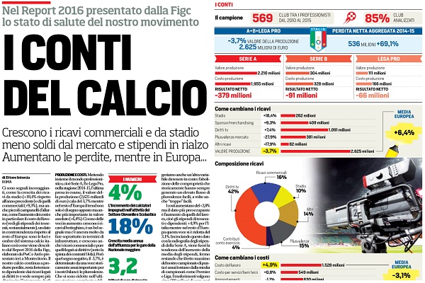 “Ci sono segnali incoraggianti, come la crescita dei ricavi da stadio (+18,4% rispetto all’anno precedente) e di quelli commerciali (+9,3%), ma anche piccoli campanelli d’allarme, come l’aumento dei costi e in particolare il costo del lavoro (vedi gli stipendi dei tesserati, sostanzialmente), un dato in controtendenza rispetto al resto d’Europa: sono le luci e ombre del sistema calcio italiano così come viene descritto dal Report 2016 della Figc, elaborato da PwC e Arel e presentato ieri a Montecitorio. Il nostro calcio continua a produrre perdite, resta fortemente dipendente dai ricavi legati ai diritti tv e vede sempre più diminuire l’intervento degli azionisti di riferimento in termini di aumenti di capitale, un po’ perché la Uefa li limita (almeno per chi vuole partecipare alle coppe) e un po’ perché la tendenza di “gestire” i soldi che arrivano dal mercato (e dalle banche) si è consolidata anche tra i top club, produzione e costi. Mettendo insieme il mondo professionistico, cioè Serie A, B e Lega Pro, nella stagione 2014-15, l’ultima presa in esame, il valore della produzione (2,625 miliardi di euro) cala del 3,7% mentre nel resto d’Europa il trend non solo è di segno opposto ma anche più importante in valore assoluto (+6,4%). Ci sono delle voci in aumento: crescono i ricavi al botteghino, è un bel segnale ma c’è ancora molto da fare soprattutto in termini di infrastrutture, e crescono anche i ricavi commerciali e pure quelli legati ai diritti tv (sotto la spinta dei contratti Uefa). Però quel segno negativo, il -3,7%, è determinato da una voce storicamente assai importante per i nostri bilanci: le plusvalenze. Che si sono ridotte nell’ultima stagione esaminata addirittura del 27,9% scendendo a 381 milioni. «Un dato legato ai minori scambi sul mercato, anche perché i grandi talenti hanno già lasciato il Paese», spiega Emanuele Grasso di Pricewaterhouse Coopers. Meno export di talenti, dunque, sostiene il Report. Suggeriamo anche un’altra variabile da tenere in conto: l’abolizione delle comproprietà che storicamente hanno sempre generato un elevato flusso di plusvalenze facili, a volte anche “troppo” facili. I costi aumentano del +2,8% ma il dato più preoccupante è l’aumento di quelli del lavoro, cioè gli stipendi di tesserati e dipendenti: +4,9% per l’Italia mentre nel resto d’Europa questa voce si è ridotta del 3,1%. Incrociando questo dato con la radiografia degli stipendi della Serie A, viene fuori la tendenza dell’aumento della media degli stipendi, fermo restando che il tetto massimo del nostro campionato di punta è assai lontano dalla media di campionati come Premier e Liga. I trasferimenti valgono circa 600 milioni di euro, pari al 20% circa dei ricavi: per ogni 100 euro che entrano nelle casse dei club professionistici, 20 se ne vanno per l’acquisto dei calciatori perdite, debiti e patrimonio. Il nostro calcio, in ogni caso, continua a generare perdite. La sola Serie A (al netto del bilancio del Parma, poi fallito, non preso in considerazione) nel 2014-15 ha generato un -379 milioni di risultato netto. L’immagine proposta da PwC per rendere meglio l’idea è questa: per ogni 10 euro di ricavi (senza le plusvalenza), la Serie A genera 2 euro di perdite, la B 3 euro e la Lega Pro 6 euro. C’è una riduzione dei debiti totali (-8,1%) ma il dato preoccupante è il crollo del patrimonio netto aggregato (-86,4%). Spiega Grasso di PwC: «Sta rallentando il supporto degli azionisti, 37 milioni di euro sono pochi per supportare un’industria che produce 3 miliardi di ricavi e ha 3 miliardi di debiti. Il sistema ha bisogno di essere finanziato, con così poco capitale di rischio è difficile tornare ad avere risultati sportivi». EFFETTO TV Anche se alcune singole voci crescono, persiste il forte squilibrio nella torta dei ricavi: il nostro calcio, e in particolare la Serie A, è ancora fortemente dipendente dai diritti tv (siamo al 42%) e dalle plusvalenze di mercato (15%). In Serie A il peso dei contratti con le emittenti addirittura è del 58% mentre in Europa è