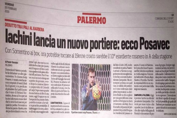 Dopo essere subentrato a Sorrentino contro il Torino ed aver debuttato da titolare contro la Roma, Alastra potrebbe adesso cedere il posto al suo giovane collega di reparto. Si tratta di Posavec, ventenne croato designato sin da subito come vice-Sorrentino, proveniente dall’Inter Zapresic. Freddo, scattante e coraggioso nelle uscite, questo il profilo del portiere rosanero del futuro, suggerito a Zamparini dai consiglieri slavi. L’ultima parola spetterà comunque a Beppe Iachini, non prima di aver consultato il fidato preparatore dei portieri Sicignano. Qualora Posavec dovesse scnedere in campo contro il Bologna, si tratterebbe del 10° esordiente in A per il Palermo. Questo quanto si legge sull’odierna edizione de “Il Corriere dello Sport”.