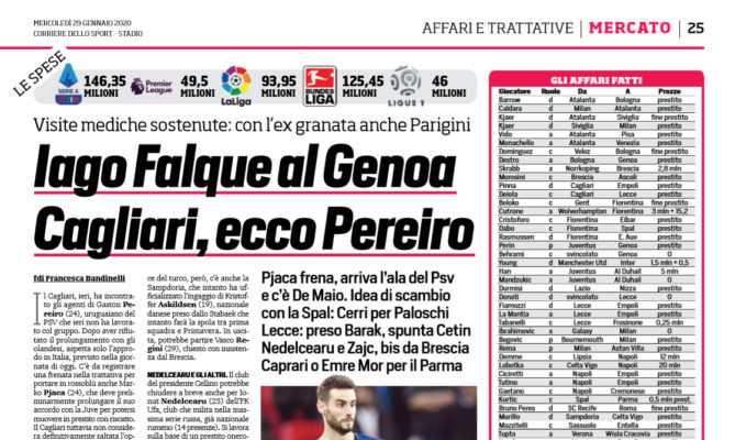 Corriere dello Sport: “Iago Falque al Genoa. Cagliari, ecco Pereiro. Tutte le trattative del giorno in serie A”