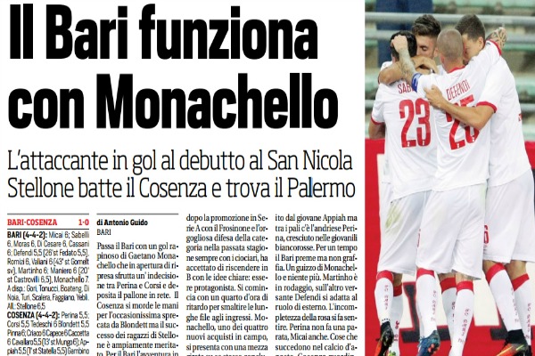 “Passa il Bari con un gol rapinoso di Gaetano Monachello che in apertura di ripresa sfrutta un’ indecisione tra Perina e Corsi e deposita il pallone in rete. Il Cosenza si morde le mani per l’occasionissima sprecata da Blondett ma il successo dei ragazzi di Stellone è ampiamente meritato. Per il Bari l’avventura in Coppa Italia continua e domenica si va a Palermo, una classica del calcio meridionale. Intanto, Roberto Stellone può essere soddisfatto aspettando che il direttore sportivo Sean Sogliano completi la sua opera di allestimento di una squadra che già comincia a convincere e a vincere. APPLAUSI. Gli applausi sono tutti per lui: il San Nicola saluta calorosamente il suo nuovo condottiero che, dopo la promozione in Serie A con il Frosinone e l’orgogliosa difesa della categoria nella passata stagione sempre con i ciociari, ha accettato di riscendere in B con le idee chiare: essere protagonista. Si comincia con un quarto d’ora di ritardo per smaltire le lunghe file agli ingressi. Monachello, uno dei quattro nuovi acquisti in campo, si presenta con una mezza girata su se stesso conclusa di poco alta sulla traversa che scalda gli spettatori sugli spalti del San Nicola. I NUOVI. L’esterno Martinho, i difensori Moras e Cassani le altre attrazioni della serata. Giorgio Roselli, una stagione in B da giocatore con Enrico Catuzzi, torna per la prima volta a Bari da nemico. Guida un Cosenza spigliato senza alcun timore reverenziale. Statella, altro ex di turno, va in panchina per un tempo sostituito dal giovane Appiah ma tra i pali c’è l’andriese Perina, cresciuto nelle giovanili biancorosse. Per un tempo il Bari preme ma non graffia. Un guizzo di Monachello e niente più. Martinho è in rodaggio, sull’altro versante Defendi si adatta al ruolo di esterno. L’incompletezza della rosa si fa sentire. Perina non fa una parata, Micai anche. Cose che succedono nel calcio d’agosto. Cosenza guardingo, meglio non stuzzicare il Bari. RIPRESA. Tutt’altra musica nella ripresa. Nel giro di soli quattro minuti il Bari sblocca il risultato. Lancio di Sabelli, rimpallo tra Perina e Corsi, arriva Monachello e ribatte il pallone in rete. Adesso è un’altra partita. Il Cosenza si apre cercando di rimontare lo svantaggio e il Bari si distende con maggiore facilità. Ma è il Cosenza ad avere l’occasionissima che Blondett (18′) concludendo debolmente di testa tra le braccia di Micai. Stellone si gioca la carta Castrovilli e la partita si riaccende ancora una volta. Sgorga spontanea l’intesa tra il gioiellino barese e il nuovo acquisto Magnocavallo. C’è anche Fedato nell’ultima mezz’ora al posto di Defendi e il Bari aumenta il suo potenziale offensivo. Castrovilli imperversa, ma il Cosenza non sta a guardare. Bel numero di Mungo però la difesa del Bari è imperforabile. Qualificazione blindata e Palermo nel mirino! Cosa chiedere di più?”. Questo quanto si legge sull’edizione odierna de “Il Corriere dello Sport”.