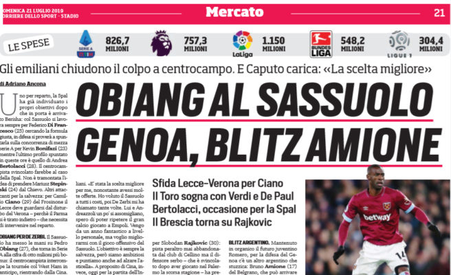 L’edizione odierna del “Corriere dello Sport” analizza le principali trattative del giorno in Serie A. La Spal ha già individuato i propri obiettivi dopo che in porta è arrivato Berisha: col Sassuolo si lavora sempre per Federico Di Francesco cercando la formula giusta, in difesa si proverà a spuntarla sulla concorrenza di mezza serie A per Kevin Bonifazi mentre l’ultimo profilo spuntato in queste ore è quello di Andrea Bertolacci. Il centrocampista svincolato farebbe al caso della Spal. Non è tramontata l’idea di prendere Mariusz Stepinski dal Chievo. Altri attaccanti per la salvezza: per Camillo Ciano del Frosinone il Lecce deve guardarsi dal disturbo del Verona che necessita di intervenire nel reparto. Il Sassuolo ha messo le mani su Pedro Obiang, che torna in Serie A alla cifra di otto milioni più bonus: il centrocampista interrompe la tournée col West Ham in anticipo, rientrando dalla Cina. Mentre ieri Francesco Caputo, intervistato da Sky, ha parlato delle sue aspettative con gli emiliani. «E’ stata la scelta migliore per me, nonostante avessi molte offerte. Ho voluto il Sassuolo a tutti i costi, poi De Zerbi mi ha chiamato tante volte. Lui e Andreazzoli un po’ si assomigliano, spero di poter ripetere il gran calcio giocato a Empoli. Vengo da un anno fantastico a livello personale, ma voglio migliorarmi con il gioco offensivo del Sassuolo. L’obiettivo è sempre la salvezza, però siamo ambiziosi e puntiamo anche ad alzare l’asticella». A proposito di Cina, invece, oggi per la partita dell’International Champions Cup tra Juventus e Tottenham troverà spazio Japhet Tanganga: il centrale di origini congolesi ha rinnovato il contratto con la società londinese – della quale è capitano nell’Under 23 – ma potrebbe cambiare maglia e ha mercato anche in Italia. Ritorno di fiamma da parte del Brescia per Slobodan Rajkovic: pista peraltro mai abbandonata dal club di Cellino ma il difensore serbo ha preso tempo. Sul tavolo c’è anche la prospettiva di un futuro in Turchia, nel Trabzonspor. Emanuele Giaccherini resta in lista per i rinforzi. Il Torino è sempre stuzzicato dai nomi di Simone Verdi del Napoli e Rodrigo De Paul dell’Udinese: l’argentino vorrebbe una vetrina internazionale, possibile nel caso granata con l’Europa League. Mantenuto in organico il futuro juventino Romero, per la difesa del Genoa c’è un altro argentino che stuzzica: Bruno Amione del Belgrano, che può arrivare per una cifra vicina ai quattro milioni. Sempre in stand-by la trattativa per Valerio Verre della Sampdoria, il Verona fa un pensierino allo svincolato Simone Padoin al quale tempo fa sembrava interessato il Parma. Il Verona ha ufficializzato Miguel Veloso che si è legato con un contratto annuale.