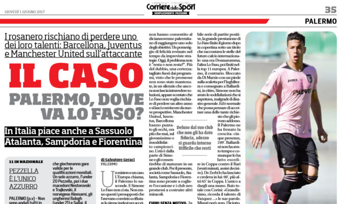 “Un mistero e un caso. L’Europa chiama, il Palermo lo nasconde. E Simone Lo Faso non ci sta. Non erano questi i presupposti che l’avevano convinto a rifiutare le sirene inglesi per accettare il progetto (!) di Zamparini: contratto di cinque anni con bonus per il suo impiego e la valorizzazione. Che non ci sono stati. In un clima di naufragio generale, le poche presenze non hanno consentito al diciannovenne palermitano di raggiungere uno solo degli obiettivi. Un pomeriggio di felicità rovinato nel tempo da impreviste strategie. Oggi, il problema non è “resta o non resta?”. Più del dubbio, una certezza: tagliato fuori dai programmi, visto che le promesse non sono state mantenute, in un silenzio che ancora non lascia intravedere soluzioni, appare scontato che Lo Faso non voglia rischiare di perdere un altro anno e si lasci convincere da nuove prospettive. Manchester United, Juventus, Barcellona hanno puntato gli occhi, ora più che mai, sul giovanissimo e insoddisfatto campioncino. L’età è dalla parte di Simone e gli consentirebbe di maturare in un grande club. Per il presente, società come Sassuolo, Atalanta, Sampdoria e Fiorentina sono pronte a cogliere l’occasione e i club neo promessi a costruire altri miracoli. FUORI SENZA MOTIVO. In Spagna non hanno mai dimenticato: 21 gennaio 2015, amichevole Under 17 a Ibiza sotto gli occhi di Conte e Oriali, la sconfitta maturata ad opera degli azzurrini dopo una interminabile serie di partite positive, la grande prestazione di Lo Faso finito il giorno dopo in copertina sotto un titolo che raccontava le stelle del futuro calcio internazionale: una era Donnarumma, l’altra Lo Faso, poi finiti nella top 11 europea. A Palermo, il contrario. Bloccato da Di Marzio con un piede sulla scaletta per l’Inghilterra e consegnato a Ballardini, in ritiro, Simone non ha avuto le soddisfazioni che si aspettava, malgrado il disastro generale. Ed è normale che possa pensare di accettare una delle tante richieste che gli piovono addosso. Il Palermo ne ha frenato la crescita: cinque presenze, 249′. Ballardini non ha avuto tempo e comunque lo ha fatto esordire in Coppa contro il Bari (venti minuti, assist decisivo). De Zerbi lo ha lanciato e credeva in lui: 69′, più altri 65′ in Coppa. L’unico a dargli una mano. Buio totale con Corini: «Grandissimo, ricorda il talento di Vazquez …» le sue parole. Minuti però zero. Diciotto, con il timoroso Lopez e 162′ con Bortoluzzi ma senza la necessaria fiducia (“La serie A è dura …”) malgrado Lo Faso fosse stato fra i più propositivi.”. Questo quanto riportato da “Il Corriere dello Sport”.