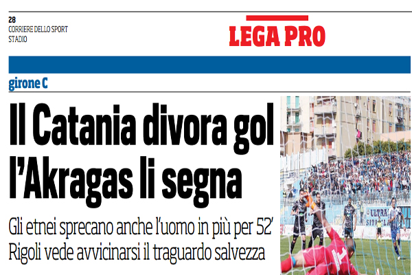 Corriere dello Sport: “Il Catania divora gol, l’Akragas li segna. Gli etnei sprecano anche l’uomo in più – le pagelle”