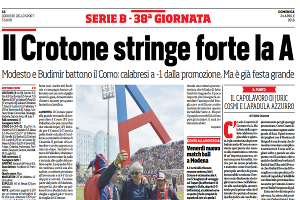 “Un’altra settimana di passione aspetta il Crotone al netto di una vittoria piena, meritata, messa al sicuro da Modesto (25′) e Budimir (44′). Un Crotone che può solo temere d’essere raggiunto, ma crediamo sia un’ipotesi irrealizzabile, nelle quattro gare che restano fino alla conclusione del campionato. E mentre solo la matematica dice ancora di no, ieri sera per le strade di Crotone si è festeggiato come se il traguardo fosse già stato tagliato. In realtà manca un solo punto, ma la squadra ha dimostrato ancora una volta di non avere rivali e di poter meritate la prima serie A della sua storia. Il Como da parte sua ha fatto quello che ha potuto, si è difeso alla grande, ha anche colpito una traversa con Bessa (39’st), dopo avere rischiato un autogol con un rinvio di Casasola che sbatte sul palo alle sinistra di Cordaz e termina sul fondo. Tutto sommato un Como che non merita l’ultimo posto in classifica, almeno per quello che ha fatto vedere allo Scida con gli spettatori che sventolavano quasi tutti una bandiera con i colori rosso e blu. Certo si sperava in un risultato diverso a Trapani, ma va bene così. Anche ieri Budimir e compagni hanno affrontato con un certo cipiglio severo la gara, dimostrando d’avere i numeri per questa fantastica classifica. la partita. Il Crotone parte alla grande cercando di sorprendere il Como (8′) con Palladino, che poi cerca il bis due minuti dopo (10′). Brivido per il Como (24′) con la palla sbatte sul palo di Scuffet su un tentativo di rinvio di Casasola. Il gol non si fa attendere e arriva appena un minuto dopo. Tentativo di tacco di Palladino, Modesto e pronto a intercettare la palla e inviarla alle spalle del portiere ospite. La squadra di Juric continua, com’è sua abitudine, a mettere pressione all’avversario e al 44′ il raddoppio è servito. L’azione parte dal piede di Modesto, sempre lui, che offre un pallone d’oro a Budimir che non sbaglia e sigla il gol nº 16 con la maglia del Crotone. RIPRESA. La ripresa offre pochi spunti con il Crotone che cerca di non affondare il piede sull’acceleratore e il Como che vuole almeno segnare una rete e mettere paura alla squadra di casa. Nel finale ci provano Brillante prima e Bessa dopo colpendo una traversa che mette paura a Cordaz. Ma ormai la squadra di Juric sente forte il profumo della Serie A e non molla di un centimetro difendendo una vittoria preziosissima che blinda di fatto l’ambito traguardo. E poco importa che bisognerà attendere l’anticipo del Braglia per certificare anche matematicamente questa incredibile Serie A. Ma per il popolo rossoblù la festa può già iniziare. E sarà indimenticabile!”. Questo quanto scrive l’edizione odierna de “Il Corriere dello Sport”.
