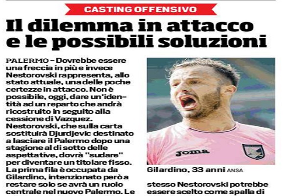 “Dovrebbe essere una freccia in più e invece Nestorovski al momento rappresenta una delle poche certezze in attacco. […] La prima fila occupata da Gilardino, intenzionato però a restare solo se avrà un ruolo centrale al Palermo. Le valutazione dipendono però dal sistema di gioco che adotterà il tecnico: con una seconda punta al fianco di un centravanti, ad esempio salirebbero le quotazioni di Trajkovski, Quaison e Bnetivegna giocatori la cui permanenza però non è affatto scontata. Se invece dovesse esserci spazio per due attaccanti puri, lo stesso Nestorovski potrebbe essere scelto come spalla di Gilardino. Per quanto riguarda Cassini, il brasiliano rientrerà alla basa, ma molto difficilmente sarà preso in considerazione per l’11 titolare”. Questo quanto si legge sull’edizione odierna de “Il Corriere dello Sport”.