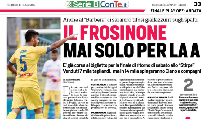 POCHI MA BUONI. Sugli spalti dello stadio palermitano, infatti, sono previsti pochi supporter di fede canarina. In particolare non faranno mancare il loro contributo di sostegno i ragazzi dei “Frusinati” cuore della curva nord. Quelli, tanto per intenderci, che nella notte del mercoledì in assoluto più fredda dell’anno, erano a Cremona per non sostenere la squadra di Moreno Longo. Così come sono stati presenti in tutte le trasferte giocate in questa stagione dal Frosinone.Partiranno alle prime luci dell’alba su due furgoni per percorrere 844,13 km, in tempo stimato (stando a Google Maps) di 10 ore e 42 minuti, traffico permettendo. Ma non sono nè la distanza nè il tempo ad aff ollare i pensieri dei fedelissimi del Frosinone che intraprenderanno questo viaggio. Bensì la fede sportiva ed un sogno che si chiama Serie A. UN SOGNO VERO. Un sogno che val bene un’intera giornata al volante e forse anche una notte insonne. Un sogno che muove le speranze e che fa battere i cuori. Mezza Italia (e anche di più) attraversata da Nord a Sud con la speranza di riportare nella rotta inversa un sorriso e la convizione di potercela fare. Se al cuor non si comanda, al Frosinone si obbedisce. Anche con quasi mille e settecento chilometri da macinare su gomma… NON SOLO AL BARBERA. Pochi ma buoni i ciociari presenti stasera al “Barbera”, mentre per la gara di ritorno in programma sabato sera al “Benito Stirpe” si va verso il tutto esaurito. Ieri a mezzanotte si è chiusa la vendita riguardante i tagliandi riservati agli abbonati della stagione 2017/2018 e si è arrivati vicino al massimo possibile (7.000). Da oggi alle 13 si aprirà quindi quella libera per tutti. I tagliandi potranno essere acquistati esclusivamente presso i punti vendita autorizzati bookingshow e online su www.bookingshow.it”. Questo quanto si legge sull’edizione odierna de “Il Corriere dello Sport”.