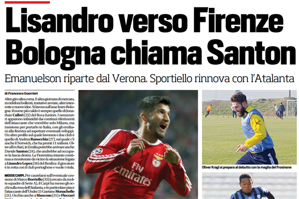 Corriere dello Sport, il mercato delle altre: “Lisandro verso Firenze, Bologna chiama Santon. Emanuelson riparte dal Verona”